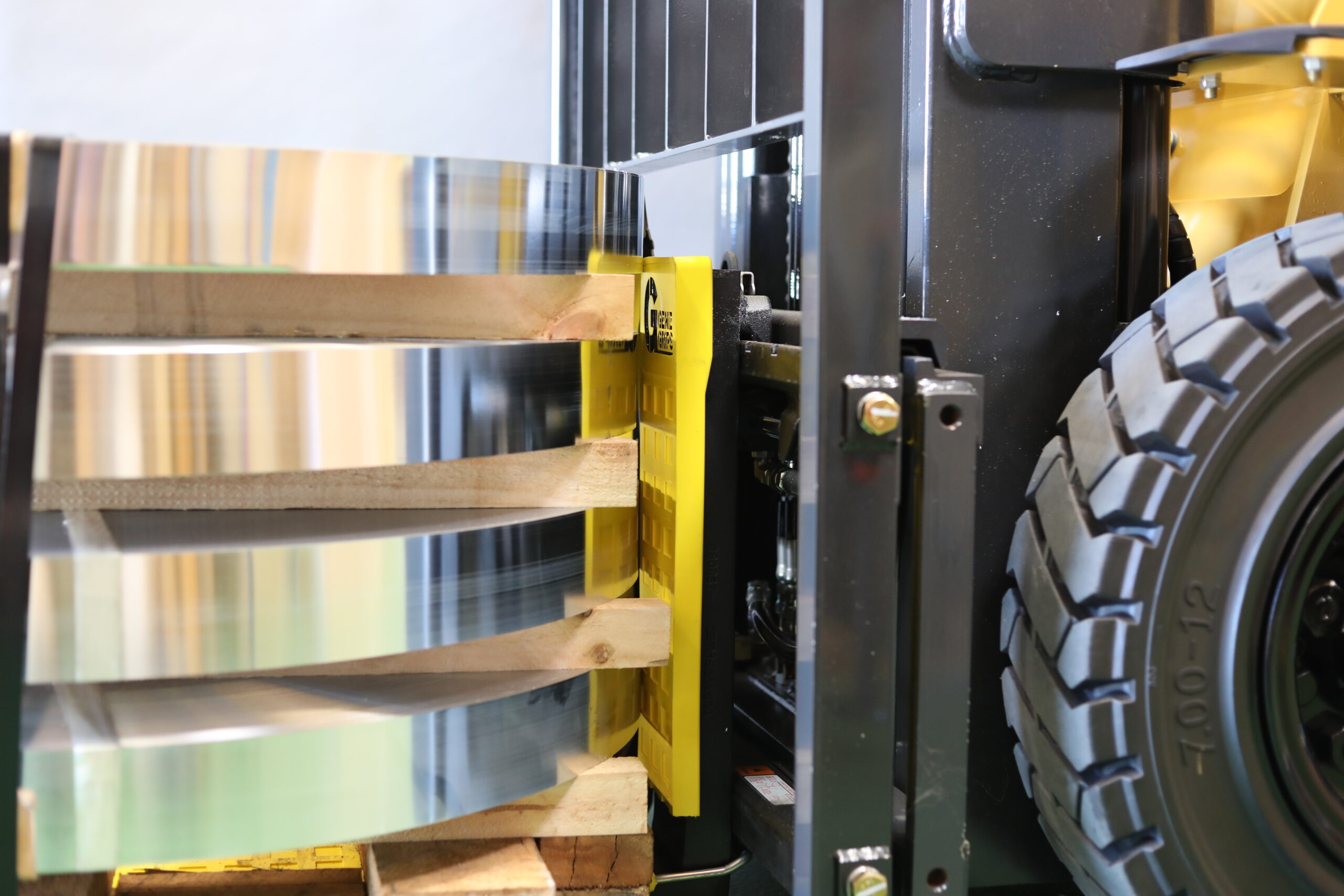 GenieGrips® Cushions function as a bumper that magnetize to the forklift tine carriage.